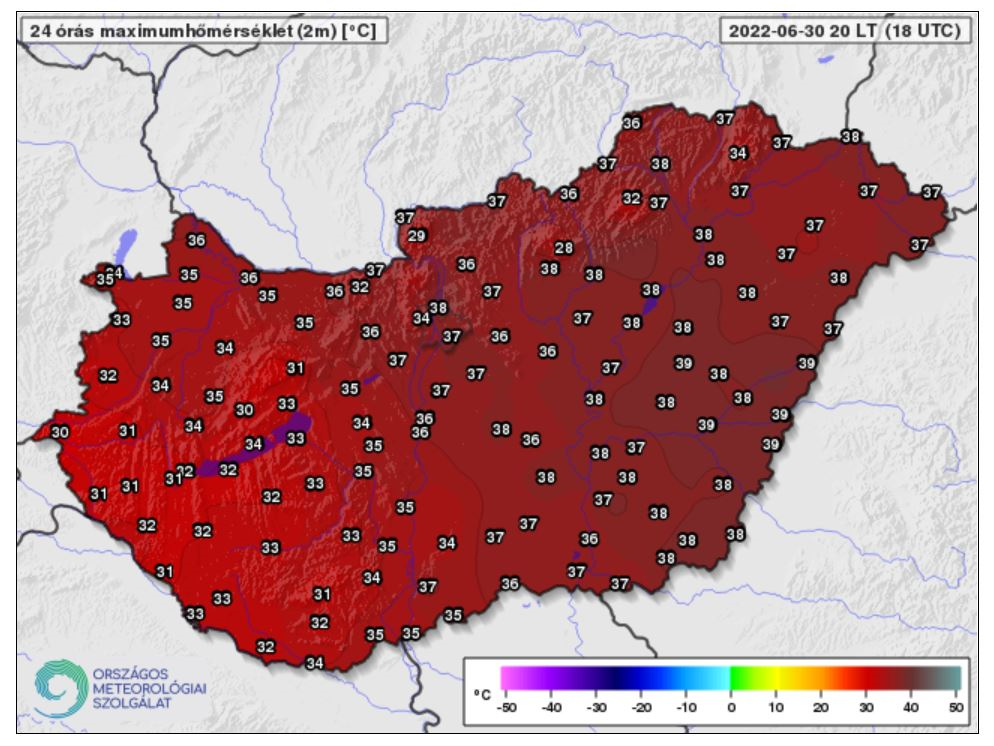 8. kép: Június utolsó napján is az Alföldön fordultak elő a legmagasabb hőmérsékletek
