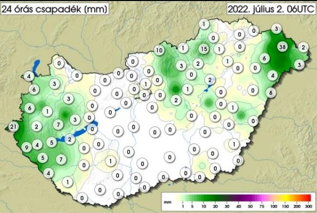 9. kép: Július 1-jén a legtöbb csapadék az ország nyugati, illetve északkeleti területein hullott