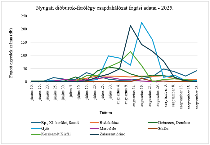 Csökkent a nyugati dióburok-fúrólegyek száma. Csak Sasad, Budakalász és Győr előrejelző ponton detektáltak dióburok-fúrólegyeket.