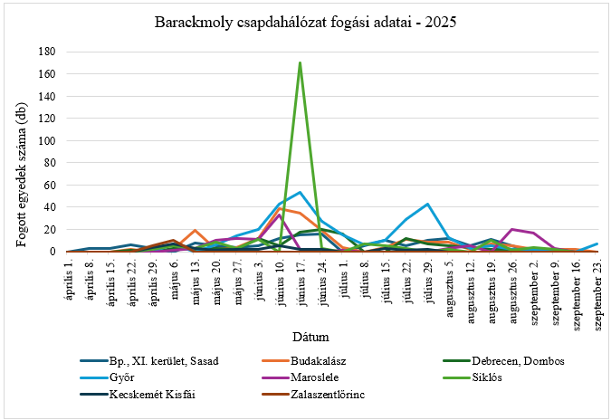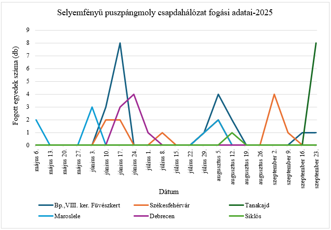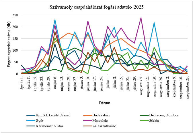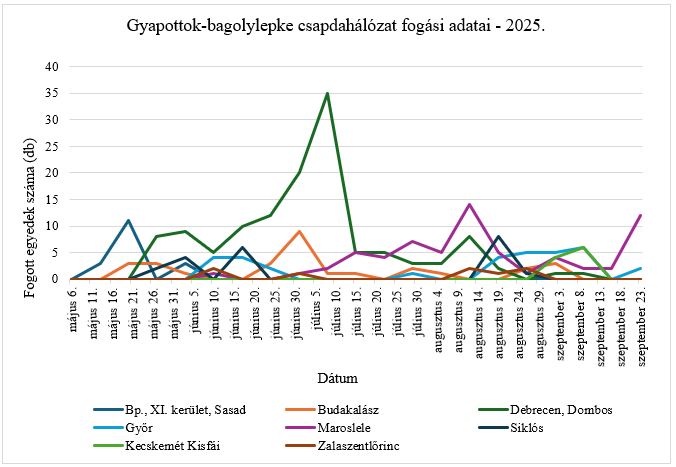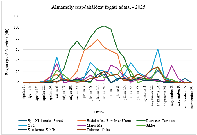 Debrecenben és Kecskeméten nem detektáltak szilvamolyt. A legtöbb egyedet Maroslelén (32 db) figyelték meg.