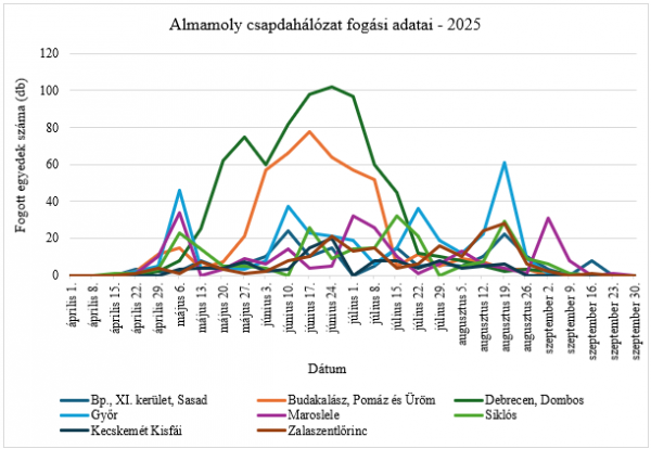 A debreceni, a siklósi, a kecskeméti és a zalaszentlőrinci megfigyelő pontokon nem detektáltak szilvamolyt. Budakalászon figyelték meg a legtöbb imágót (15 db).