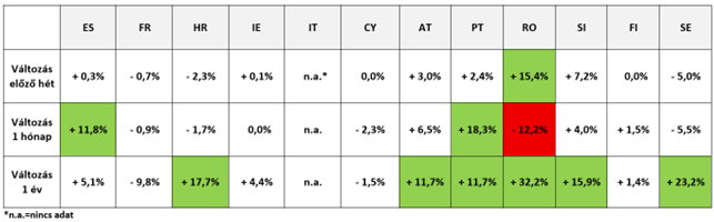 A 40. héten a nehéz bárány árak tekintetében Romániában 15,4%, Szlovéniában 7,2%-os, Ausztriában 3,0%-os, Portugáliában 2,4%-os, Spanyolországban 0,3%-os, Írországban 0,1%-os emelkedés, Svédországban -5,0%-os, Horvátországban -2,3%-os, Franciaországban pedig -0,7%-os csökkenés volt tapasztalható az előző heti árakhoz képest.