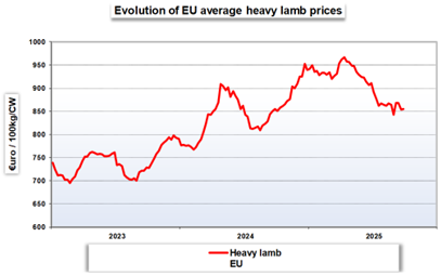 A nehéz bárány átlagára az EU-ban a 2025. október 5-vel végződő 40. héten 855,4 euró/100 kg vt. (vt. = vágott testtömeg), a könnyű bárány átlagára pedig 918,3 euró/100 kg vt. volt. A nehéz bárányár esetében -0,1%-os csökkenés, a könnyű bárányár esetében pedig 0,8%-os emelkedés volt tapasztalható az egy héttel korábban rögzített értékekhez képest (39. heti árak: nehéz bárány átlagár 856,2 euró/100 kg vt., könnyű bárány átlag 910,7 euró/100 kg vt.).
