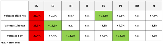 A könnyű bárány árak tekintetében a 40. héten Lettországban 11,1%-os, Szlovéniában 4,0%-os, Portugáliában 2,5%-os, Spanyolországban 2,2%-os emelkedés, Bulgáriában pedig jelentős, -25,7%-os csökkenés volt tapasztalható az előző heti árakhoz képest.