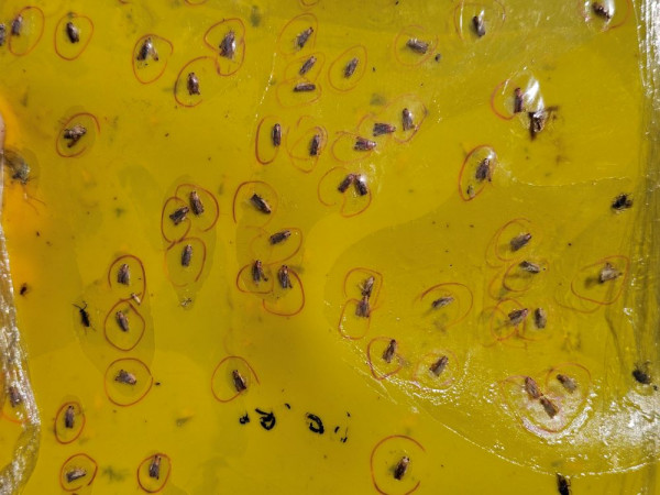 1. Kép: Amerikai szőlőkabóca sárga ragacslapon (pirossal bekarikázva)