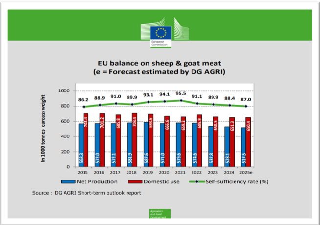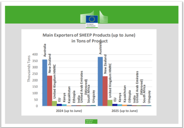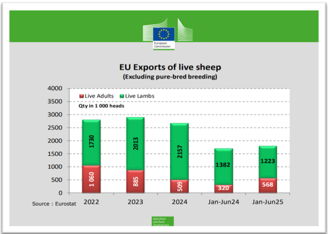 Az EU juh- és a kecskehús, valamint élő állat kivitele 2025 első félévében 54 616 tonna vt. (vt. = vágott testtömeg) volt, mely összesen 481 millió Euro értéket képviselt. A kivitel mennyisége 3 514 tonna vt. értékkel (6,8%), értéke pedig 80 millió Euro-val (19,95%) emelkedett az előző év azonos időszakához viszonyítva.