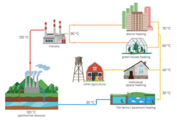 A hatékonyság miatt a kaszkád rendszerek első lépcsői közé az ipari létesítmények tartoznak, ahova a termálvíz még 100 Celsius-fok feletti hőmérséklettel érkezik. Ezt követően általában a távfűtés és az üvegházak, majd a családi házak és a mezőgazdasági létesítmények következnek. Amennyiben a rendszer kétkutas kialakítású, az utolsó lépcsőfok után a fluidum visszasajtolásra kerül. A visszasajtolás a hasznosítás egyik fontos része, hiszen a geotermikus energia akkor sorolható a megújuló energiák közé, hogyha a kitermelt fluidum kellő mennyiségben és minőségben visszasajtolásra kerül (1. ábra). Hazánkban is létesültek már ilyen rendszerek, Orosháza és Hódmezővásárhely esetében a települések energiaellátásának jelentős hányadáért felelősek.